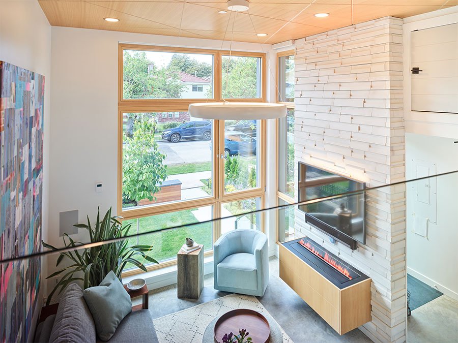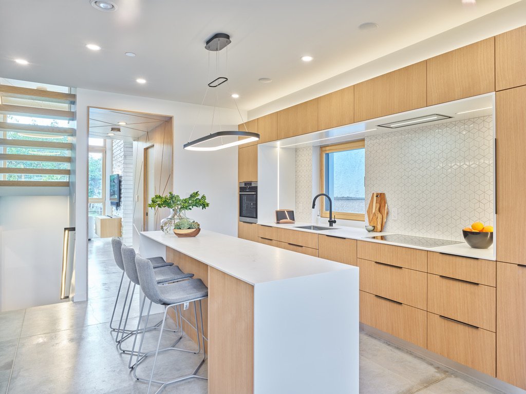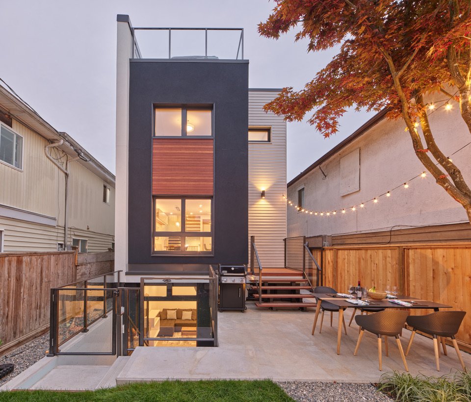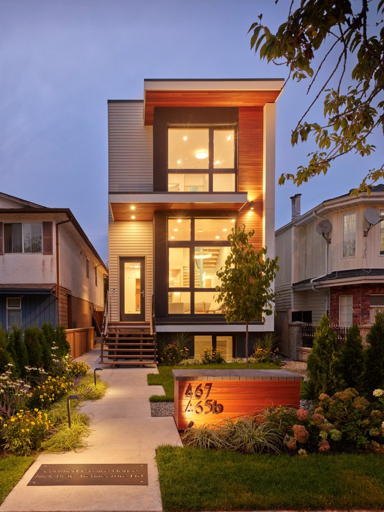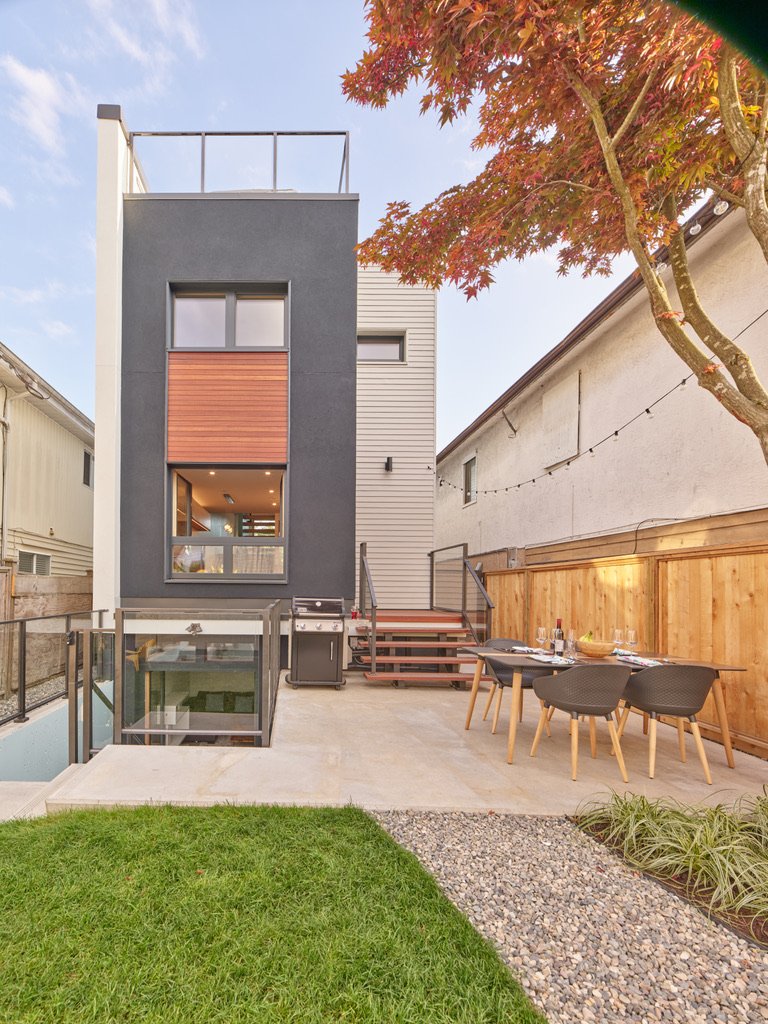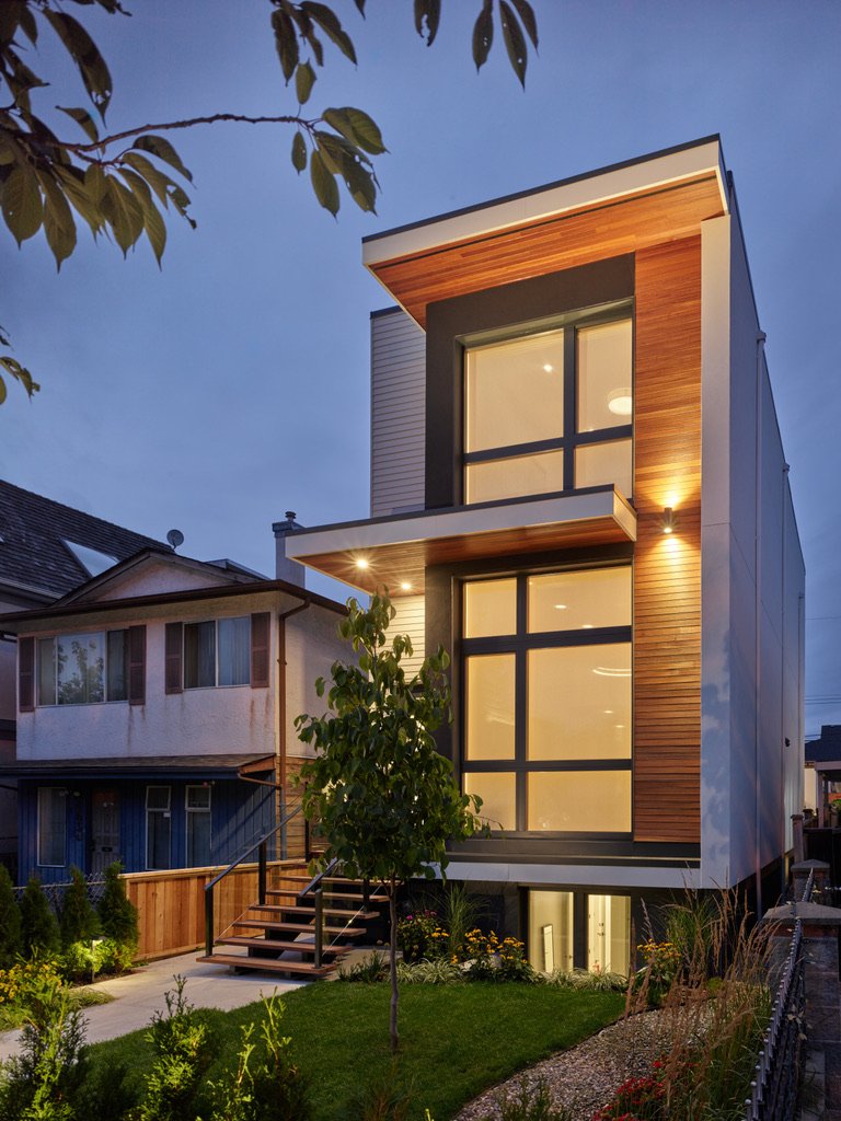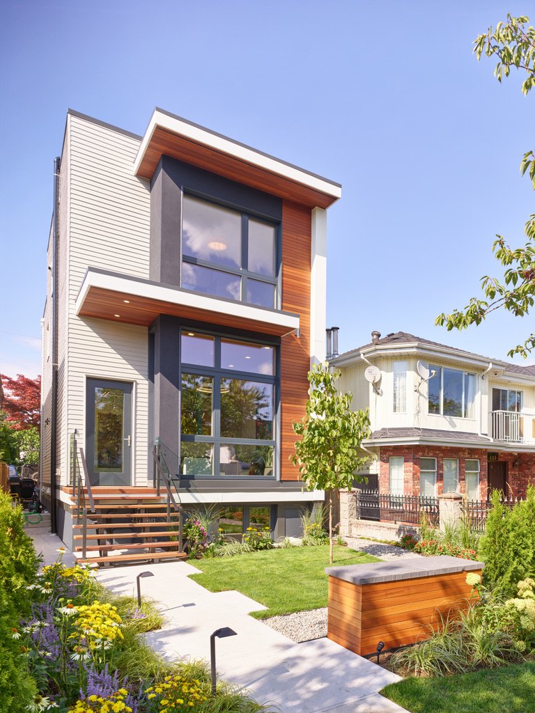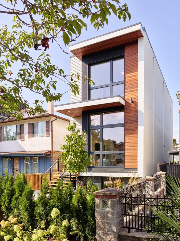 he parameters of this project were different: slotted on a narrow Vancouver lot with a frontage of 25’, located in a peat-bog zone where the soils can only be “piled” into to anchor a structure, this project presented a variety of challenges. Designed by Nick Bray Architecture, this Certified Passive House presented the perfect storm of challenges. It is the only house in the peat-bog zone that has a basement, therefore clever sequencing and waterproof measures had to be planned to ensure that the basement portion of the home would not be breached by the fluctuating water table. Furthermore, the entire structure needed to be air-tight to meet Passive House requirements, while being heavily insulated to ensure heat was retained. Equipped with photovoltaic panels on the roof-top, the home does not use any fossil fuels for heating or cooling.